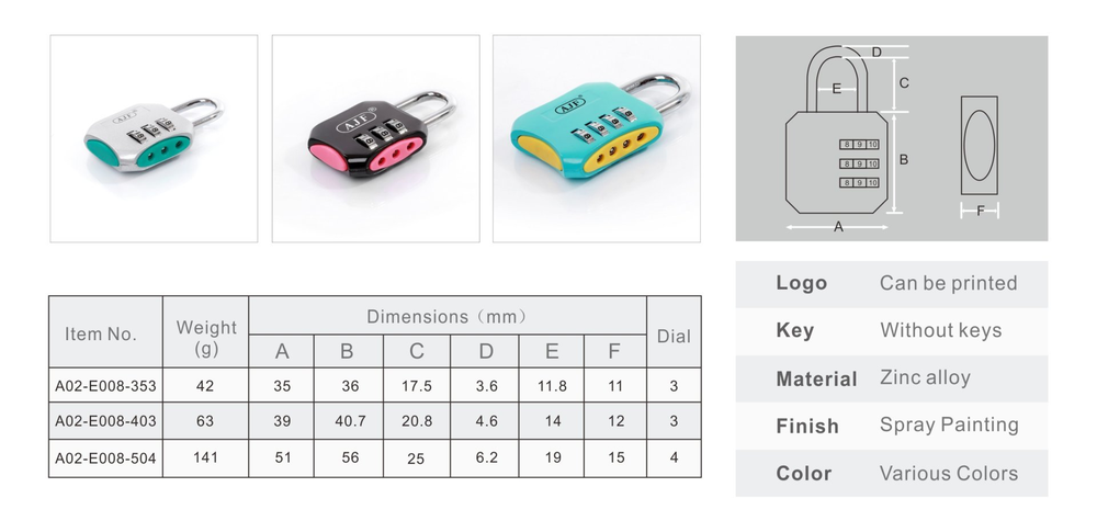 Sizes & Styles: 35,40,50mm. 3 digits or 4 digits locks. Shapes could be customized.